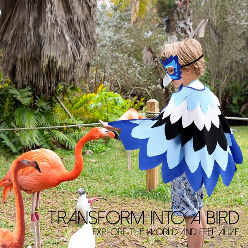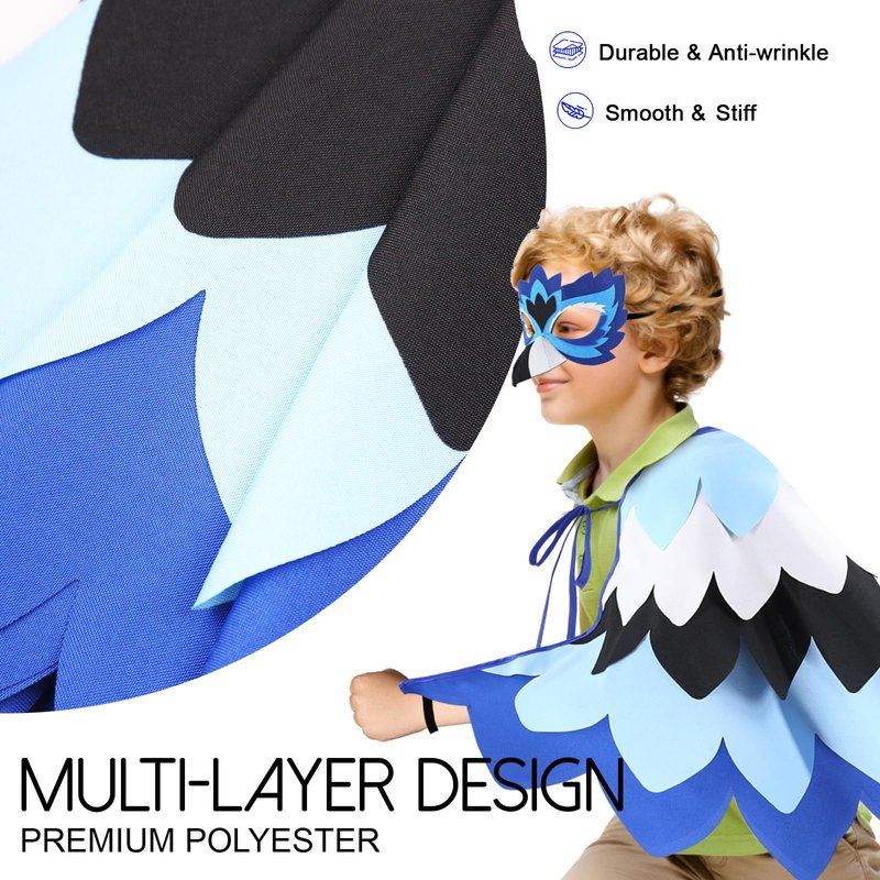 - Show Your Feathers: Bird wings costume for kids Halloween costume, made of durable polyester and completely wire-free for extra comfort. We made bird masks of eco-friendly felt with 3D beak. You won't need binoculars—the vibrant colors make these bird feather capes easy to spot from a mile away