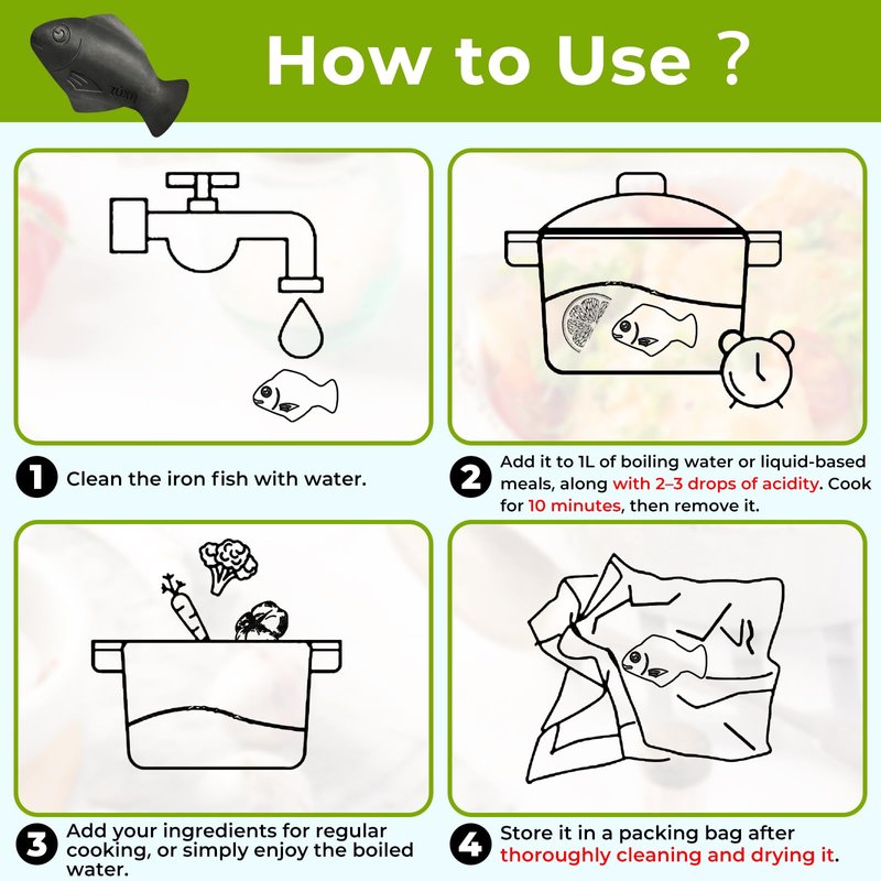 - 👍 Easy to Use: Start by cleaning the iron fish with water, then add it to 1L of boiling water or liquid-based meals along with 2-3 drops of acidity (such as lemon, lime, apple cider vinegar, tomato juice, etc.). Cook for 10 minutes, then remove the iron fish to obtain food rich in iron.