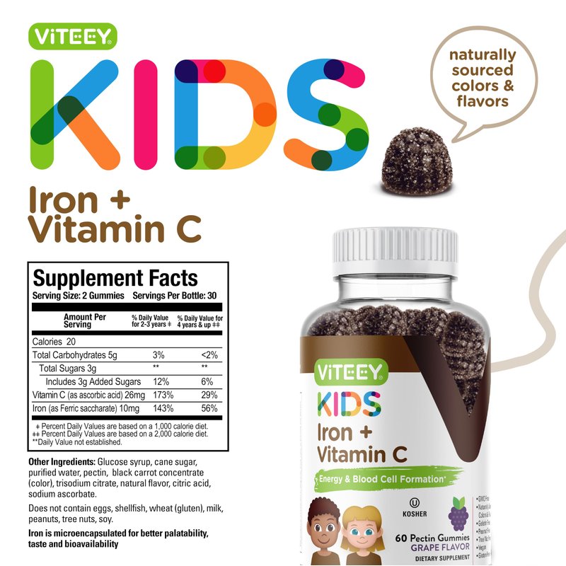 - ENERGY AND REGULARITY BLOOD SUPPORT - Our specially formulated iron supplements for kids deliver the perfect combination that can support energy, blood cell formulation & blood builder. Viteey's kids iron gummies ingredients are perfectly formulated and combined for kids and teens. Easy & convenient to take at home or on the go.