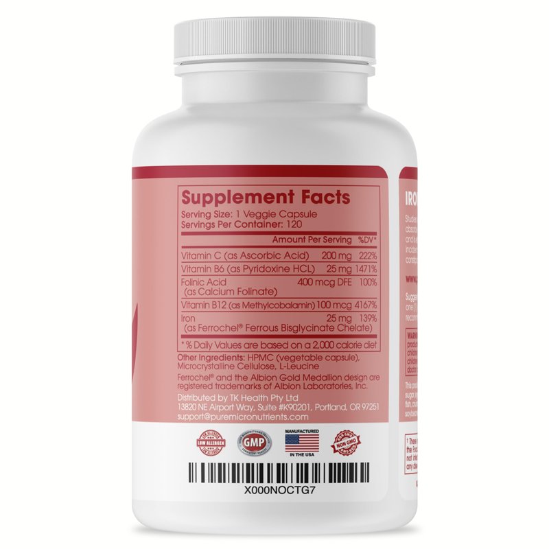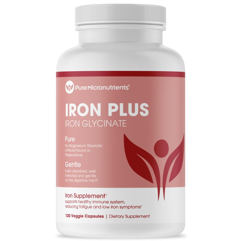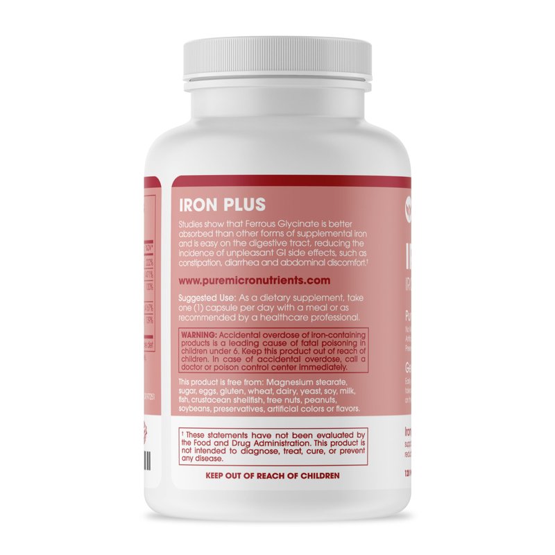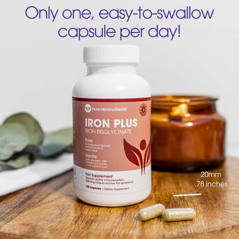 Pure Micronutrients' Iron Plus is a small Easy-to-Swallow gentle iron chelate supplement that provides over 100% of your required daily intake in a convenient 4-month supply per bottle.