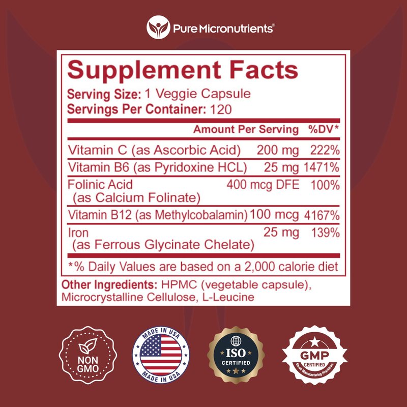 - FAST ACTING, QUICK RESULTS, 5-MTHF Approved – Clinically proven to be Highly Absorbable, our Iron Chelate coupled with Vitamin C, B6, B12 plus Folinic Acid, help red blood cell formation and ensure faster acting results. Ideal for women, men, prenatal, post-operative, or teenagers who maybe low in iron, suffer from anemia or have the MTHFR gene