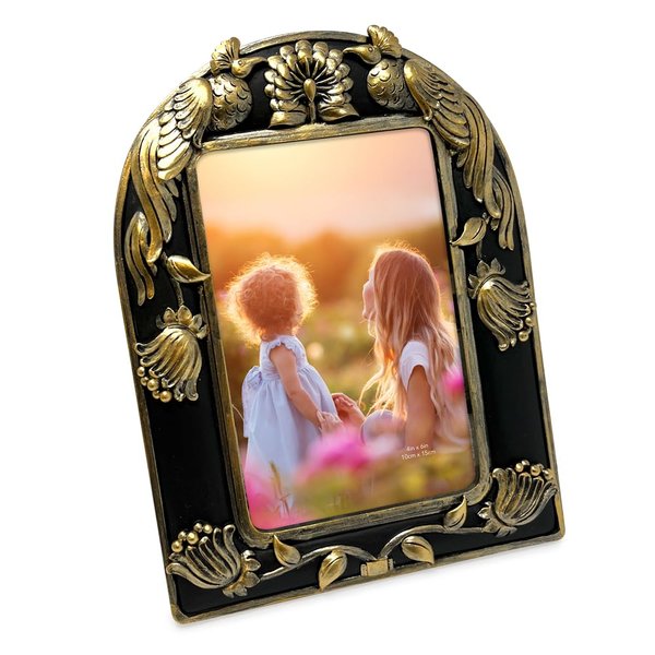 Isaac Jacobs 4x6 Black with Gold Peacock Arch Frame with Easel for Tabletop Display, Decorative Art Design, Home Décor (4x6, Black with Gold)