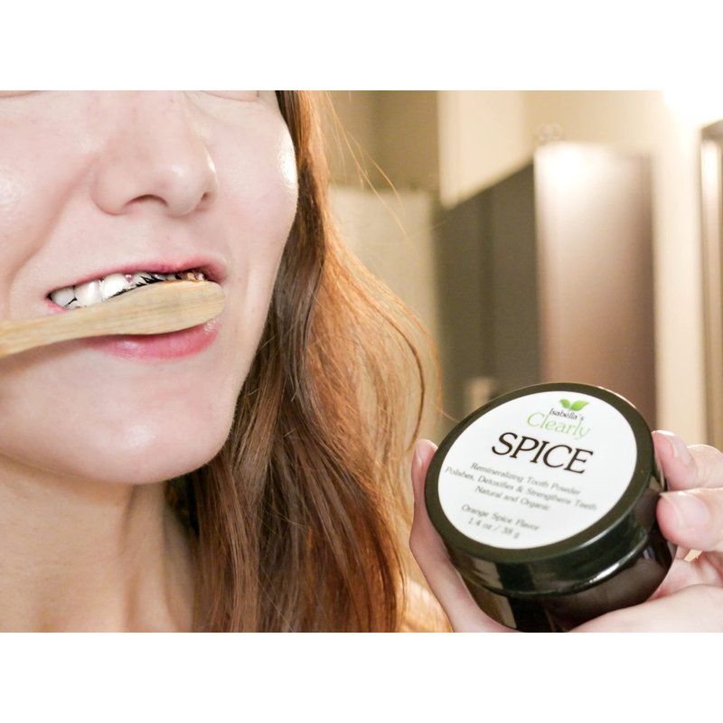 Isabella's Clearly SPICE is natural and healthy toothpaste powder. Our natural baking soda and xylitol toothpaste powder enriched with high mineral content nourishes the gums and teeth to aid in teeth remineralization, to help strengthen the teeth, repair tooth enamel and prevent tooth decay. Our fluoride free toothpaste is an organic toothpaste that neutralizes excess acids to reduce plaque and restore dental health. Our natural tooth powder is ideal for adults and kids looking for a flouride free toothpaste. The sensitive toothpaste powder contains essential oils that freshen the breath and reduce bleeding in the gums. Our natural cinnamon toothpaste flavor is loved by adults and kids! A natural mild abrasive teeth whitening toothpaste gently polishes and removes stains from the enamel revealing whiter brighter teeth - a great alternative to activated natural charcoal whitener toothpaste or other teeth whitening kits. If you are looking for a toothpaste without fluoride, toothpaste for sensitive teeth, toothpaste whitening, whitening toothpaste for adults, whitening toothpaste for kids, travel toothpaste, remineralization gel, remineralizing mouthwash, powdered toothpaste, tooth mineral powder, teeth whitening powder, charcoal powder, tooth powder for remineralizing, all natural toothpaste fluoride free, all natural toddler toothpaste, all natural toothpaste for sensitive teeth, all natural toothpaste no chemicals, then give our tooth powder a try! Our all natural baking soda powder toothpaste is made with food grade bentonite clay, calcium carbonate, organic Xylitol, mint leaves and essential oils without toxins, preservatives, chemicals, glycerin or artificial flavors. Our sustainable products are made in small batches in the USA to help remineralize teeth because tooth remineralization is a key factor in dental hygiene. Choose from 2 flavors, clearly MINT, fresh mild mint flavor and clearly SPICE, made with organic cinnamon, nutmeg and clove.
