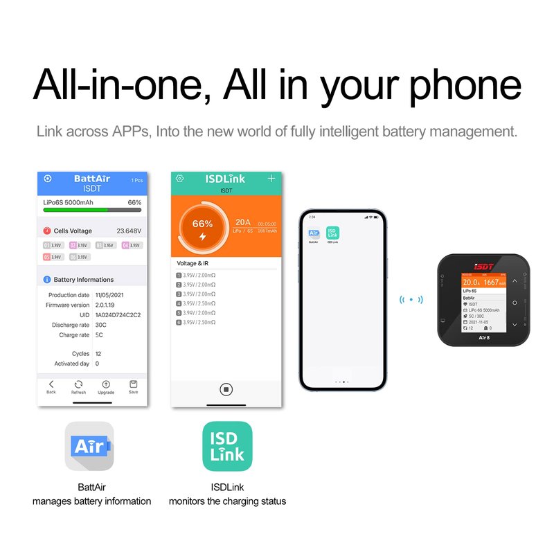 ISDT Air8 Lipo Battery Charger, Balance Charger Discharger 20A 500W DC 1-8S LCD Display Digital Smart Battery Balance Charger Li-Po Li-Hv Li-Ion Li-Fe NiMH Ni-Cd Pb