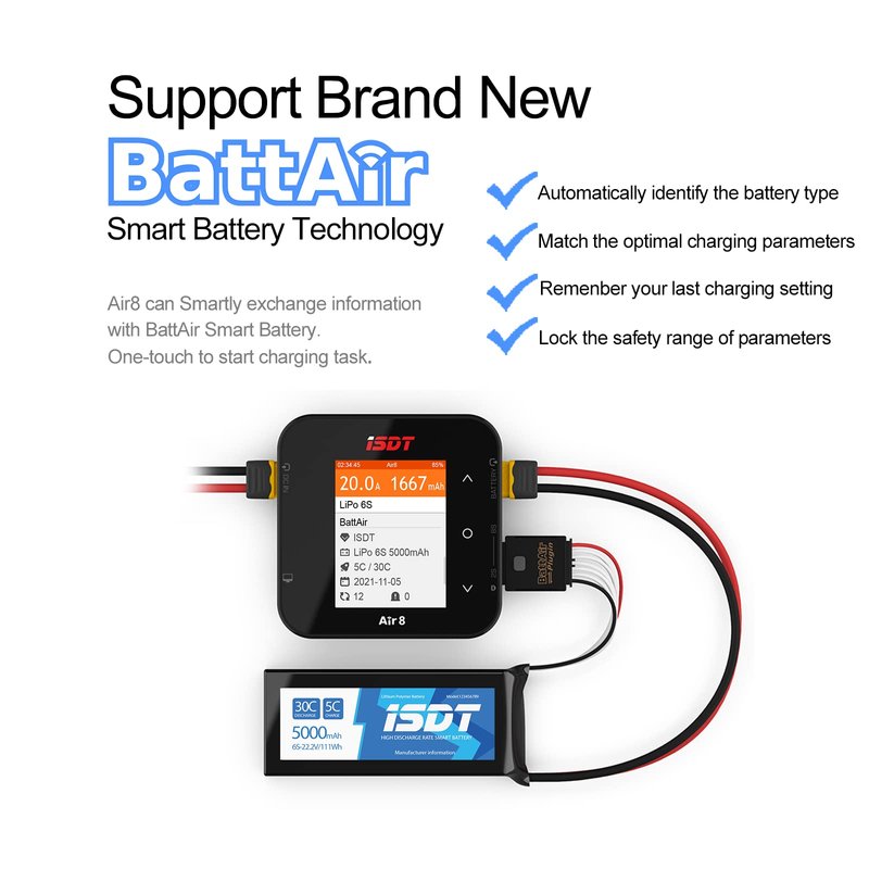 - ▶ 【Support 8S ULiHv Battery】 - Air8 support 1~8S Life, Lilon, Lipo, ULiHv batteries, even includes the ULiHv battery with 4.45V/cell.Also support 1~12S Pb battery and 1~16S NiMH/Cd battery.