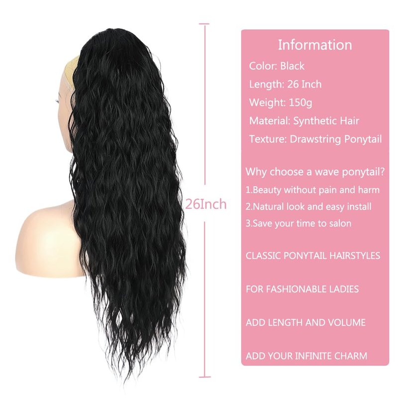 ISIGROSI Curly Ponytail Extension 26” Black Curly Drawstring Ponytail for Black Women Synthetic Heat Resistant Pony Tails Hair Extensions Drawstring Ponytail Hairpieces for Women Daily Use-Black
