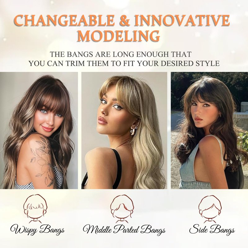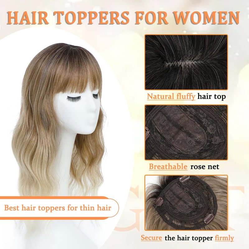 "This wavy hair topper is designed with natural french bangs, it will perfectly shape your face and bring you a more beautiful look. The texture is similar with hair toppers for women real human hair. Many reasons you will like our hair topper with bangs. Frame Face: If you have a thin hair, the best way to frame your face is with this clip in hair toppers for women. Just get our clip in bangs and enjoy your new look. Natural look: Our hair toppers for women use a mimic scalp with natural hair seams, no one will guess the key to having wonderful bangs. Save Time: Wig topper are designed to be easy to wear. Make a sleek, modern and classy hairstyle in just 2 minutes. Wearing Tips Choose Position: Decide where to place the clip in hair toppers for women. Attach the womens hair toppers: Click the clips to hold the wig topper. Just a slight adjustment and done. Our hair toppers for thinning hair are designed with long curly hair style, you can freely repair according to your own hair length to frame your face better."
