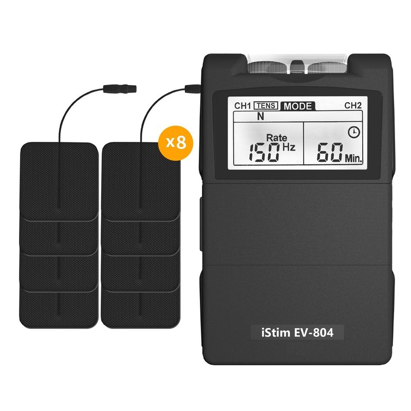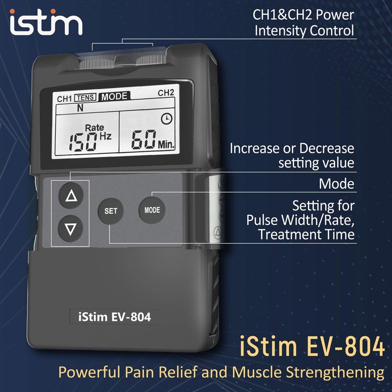 - iSTIM EV-804: Digital TENS EMS combo stimulator comes with 2 channels, 5 TENS modes, 2 EMS modes and 24 preset programs, sending comfortable impulses through the skin that stimulate the nerve fibers in the treatment area. Effectively Block the pain signal to your brain! Safe and highly effective stimulation helps for treating chronic or acute pain (e.g. shoulder tension, back pain, arthritic, knee pain) and provides muscle relaxation and muscle strengthening.