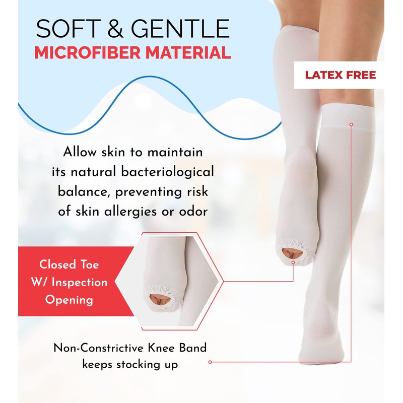 - COMPRESSION FOR INCREASED CIRCULATION - These Anti-Embolism Knee Highs provide therapeutic level compression of 18 mmHg that reduces patient’s risk of pulmonary embolism and blood clots. The light compression stockings reduce swelling, fatigue, cramping and pain in the legs, ankles and feet.