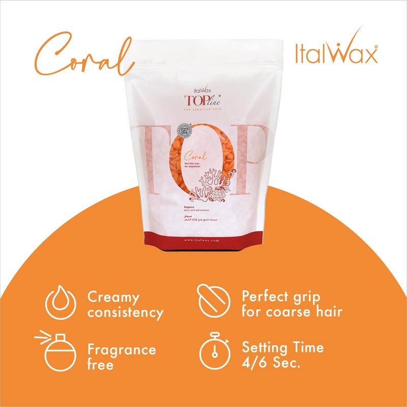 Italwax Top Line Coral - 750g / 1.65lb - Hard wax beads for hair removal - Unscented - Synthetic formulation ideal for sensitive skins - Recommended for Bikini Area and Armpits