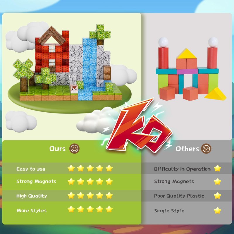 - MEET YOUR KID'S KING/QUEEN DREAMS: Magnet blocks can satisfy kids wild imagination, rich patterns and characters to attract kids attention, by building, remodeling their world busy for hours. Unleash the creativity of boys and girls while helping parents get rid of the hassle of bringing up kids.
