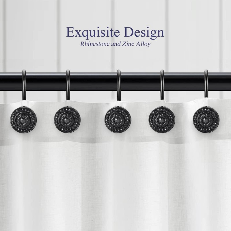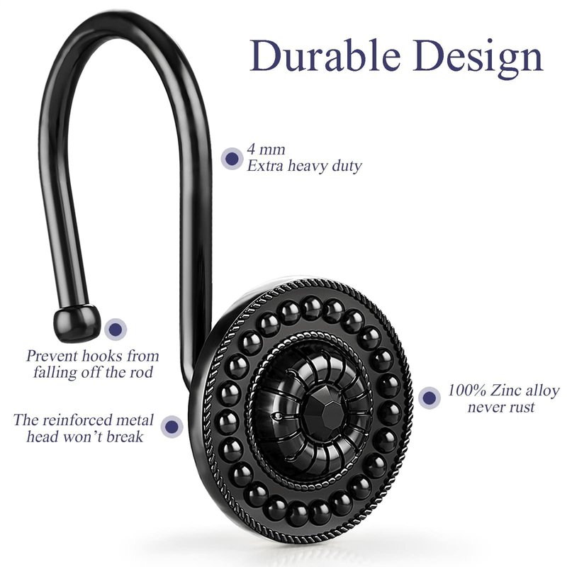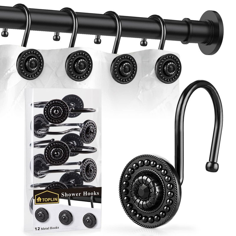 iToplin Shower Curtain Hooks, Decorative Shower Curtain Rings, Rust Resistant Metal Shower Hooks for Bathroom, Rust Proof Shower Hooks Hangers for Shower Curtain Rod, Curtain Hooks, Set of 12 (Black)