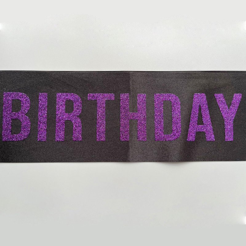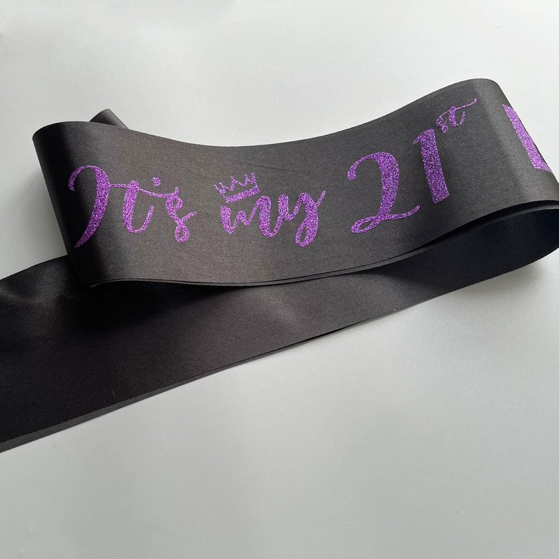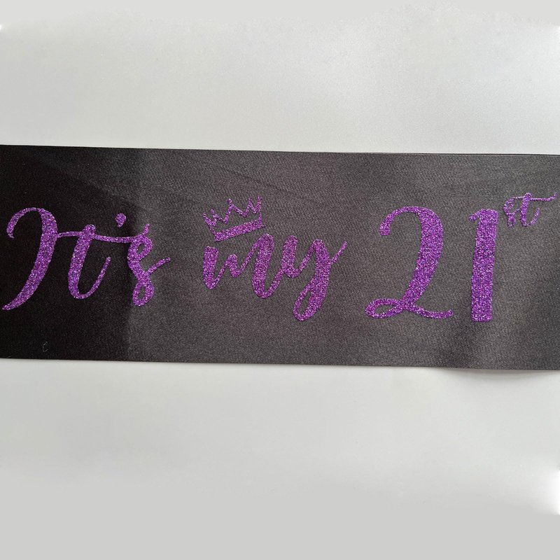 Material: The "It's my 21st BIRTHDAY" sash is made of black soft quality satin sash with purple glitter lettering. Color: black sash with purple letter Size: 31.5 inches(80cm) length (one side), and 3.74 inches(9.5cm) width.