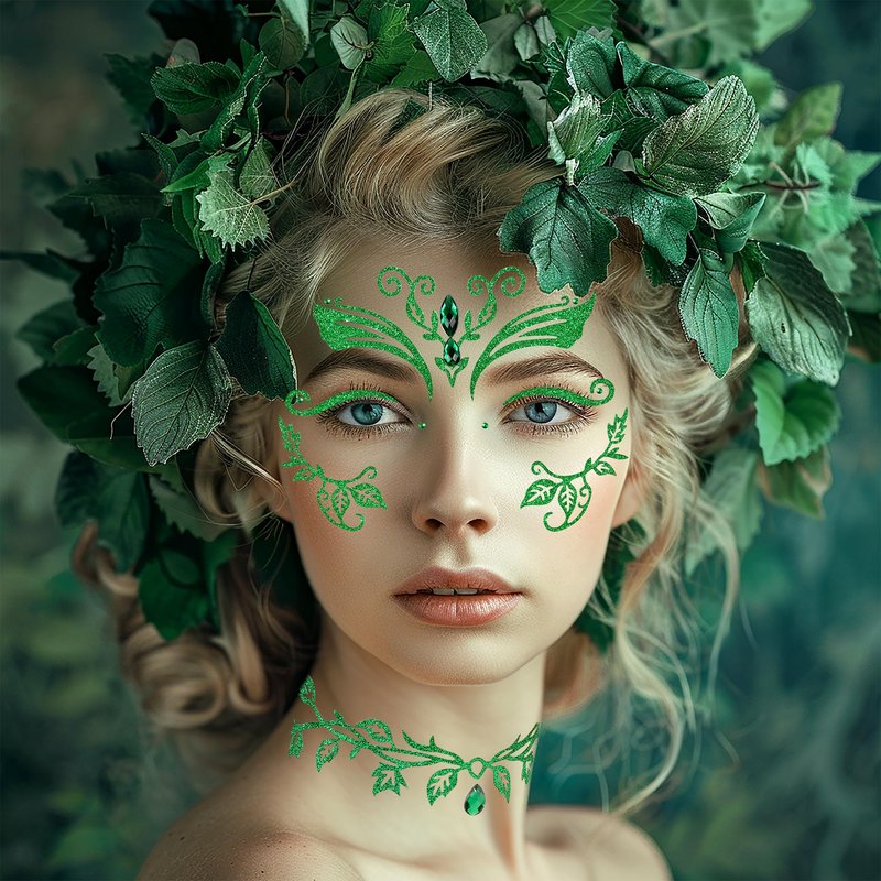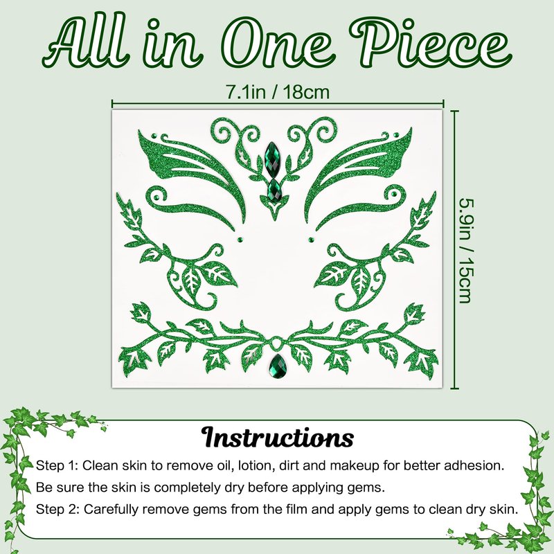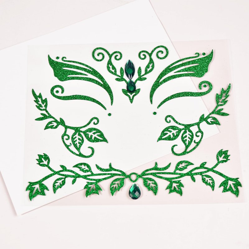 - Green Face Jewels Sticker - Green face gems stickers inspired by the leaves. Unique handcrafted green face gems stick on tattoo stickers. Complete your festival outfit with these amazing gems! Use these crystal holographic to accent your beautiful face gems makeup.