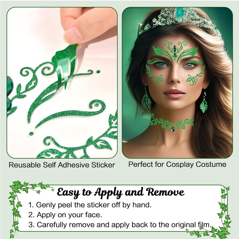 - Self-adhering & Easy to apply - The Halloween face gems stickers come with an adhesive back, which is convenient to use, face gems with glue just peel them off the sheet, and green face jewels stick on the face, easy to peel off and stick on, with no need for any glue. (Please make sure your face is dry before sticking the crystal face jewels.)