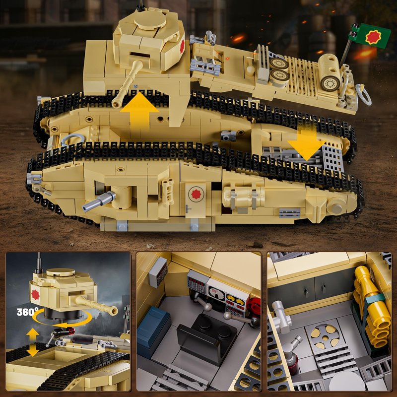 - Highly Restored Details: The set includes all the pieces you need to build your own tank, captivates with iconic earthy yellow and Nazi flag on the exterior, not only features the full-range aiming function, allowing 360°rotation for all-around shooting, but also features numerous detachable and openable parts for added playability