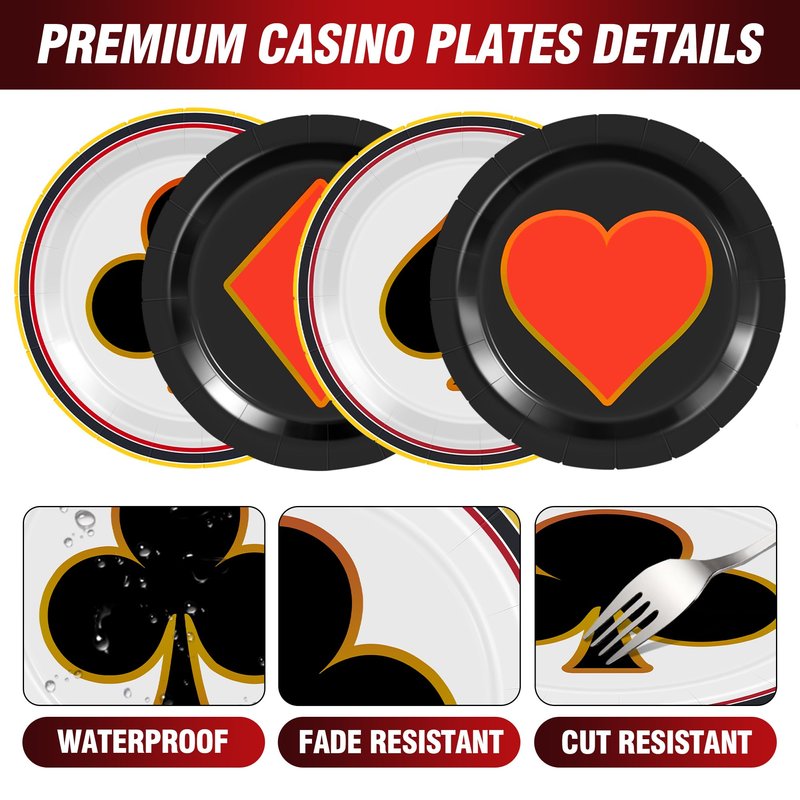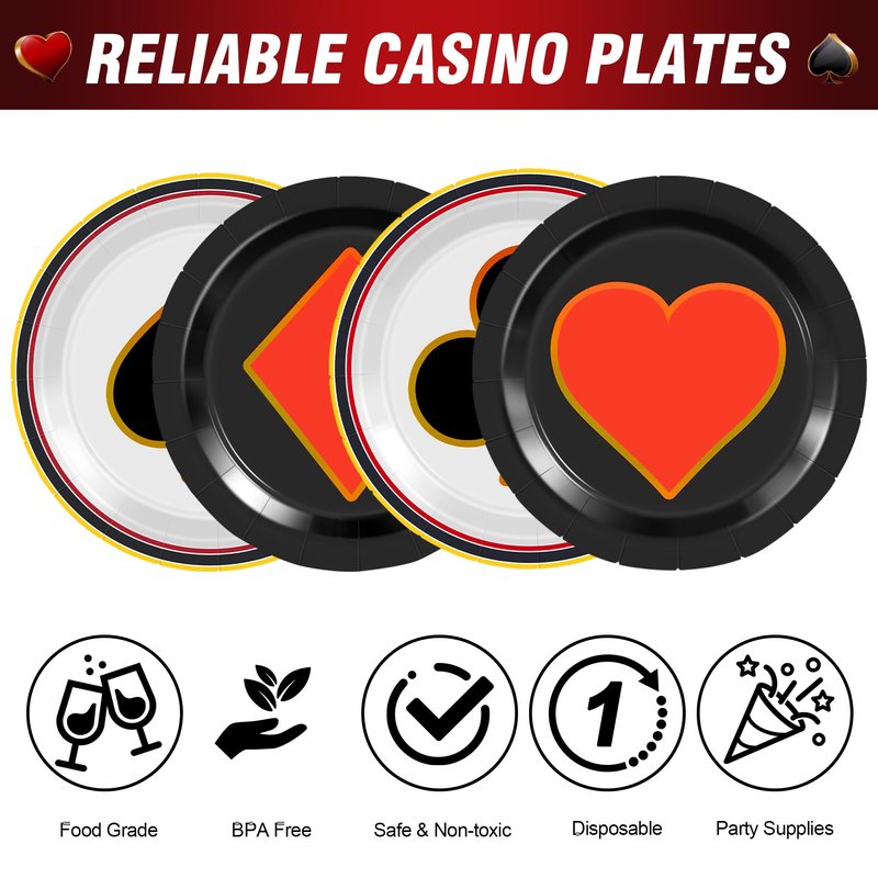 - ♥️【Casino Theme Plates】 Our casino party supplies include 48pcs of 7" poker dessert plates, allowing you to easily host various themed parties and daily activities. Whether it's serving food or enhancing your party decorations, these high-quality plates are designed to meet all your needs.
