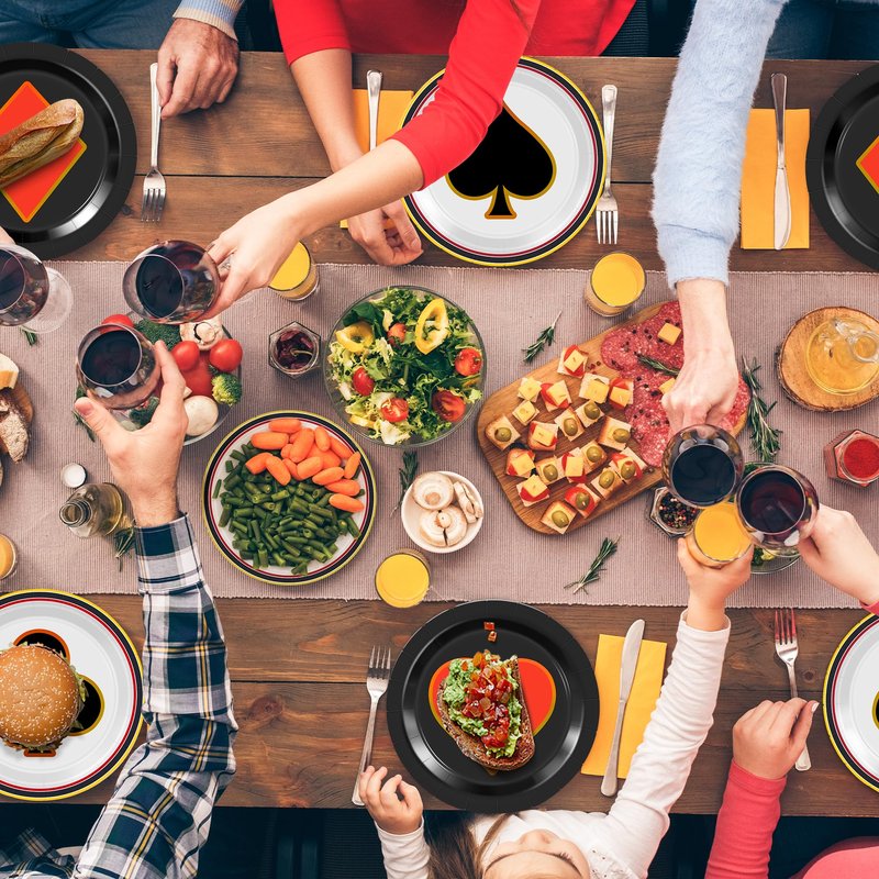♥One of the greatest advantages of our poker party decorations is their odorless nature. Rest assured that your food will not be tainted by any unpleasant smells commonly associated with low-quality tableware. This feature allows you to serve various delicious treats, including snacks, hamburgers, mouthwatering appetizers, fruits, cakes, bread, delectable desserts, candies, and even French fries, with complete confidence.