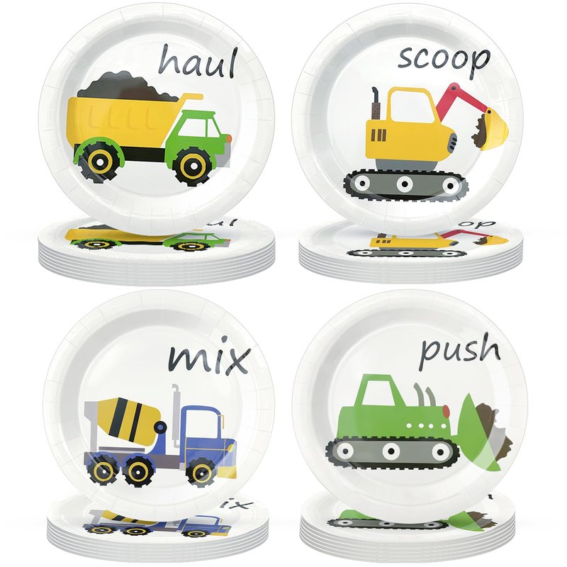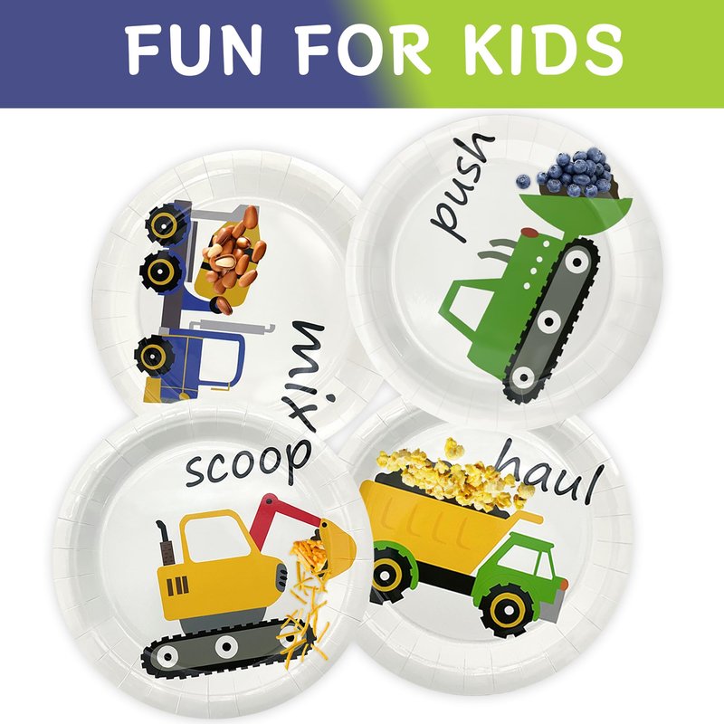 - Construction Themed Party Supplies: This construction tableware set contains 4 different designs, such as mixer, excavator, bulldozer and dump truck. Bright colors and beautiful patterns. These truck plates for toddlers and kids not only serves as functional tableware but also helps stimulate your child's imagination in every meal.