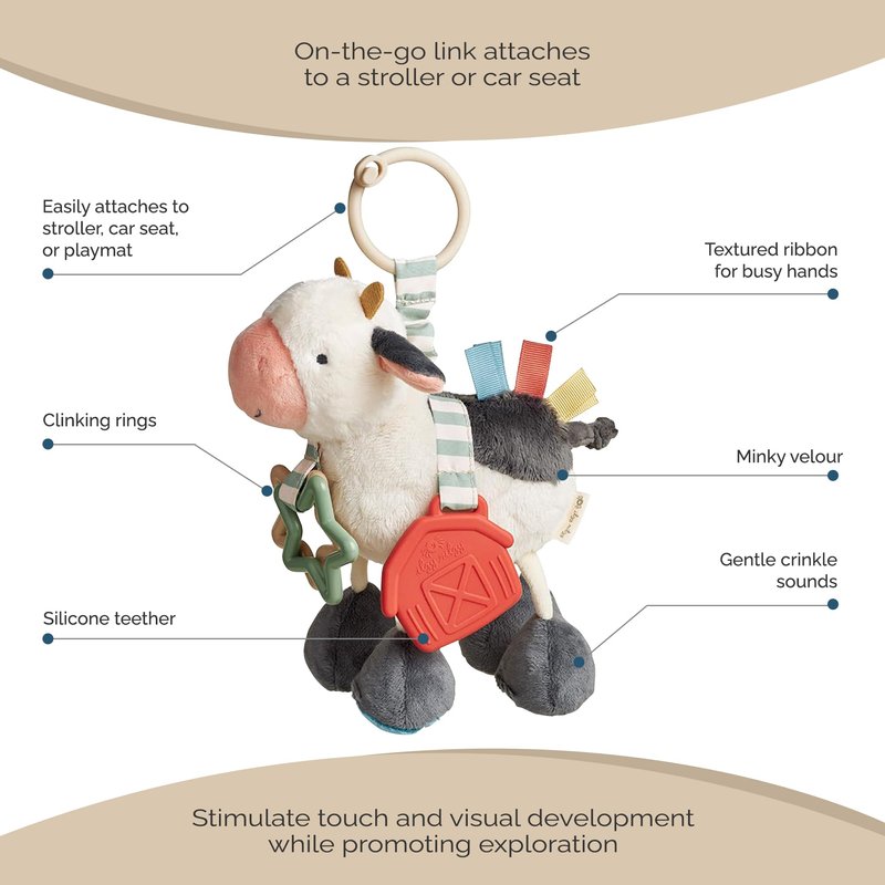 Itzy Ritzy Link & Love Toy for Stroller or Car Seat; Features Textured Ribbons, Crinkle Sounds, Clinking Rings & Silicone Teether; Designed for Ages 0 Months and Up (Cow)