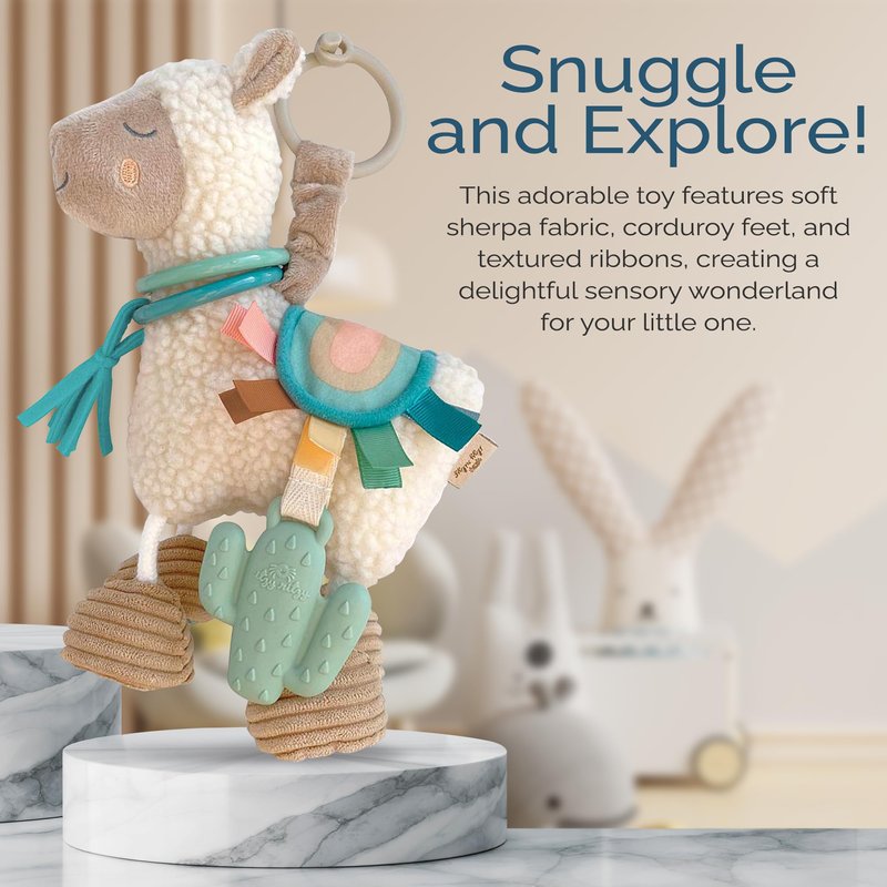 Itzy Ritzy Link & Love Toy for Stroller or Car Seat; Features Textured Ribbons, Crinkle Sounds, Clinking Rings & Silicone Teether; Designed For Ages 0 Months and Up (Llama)