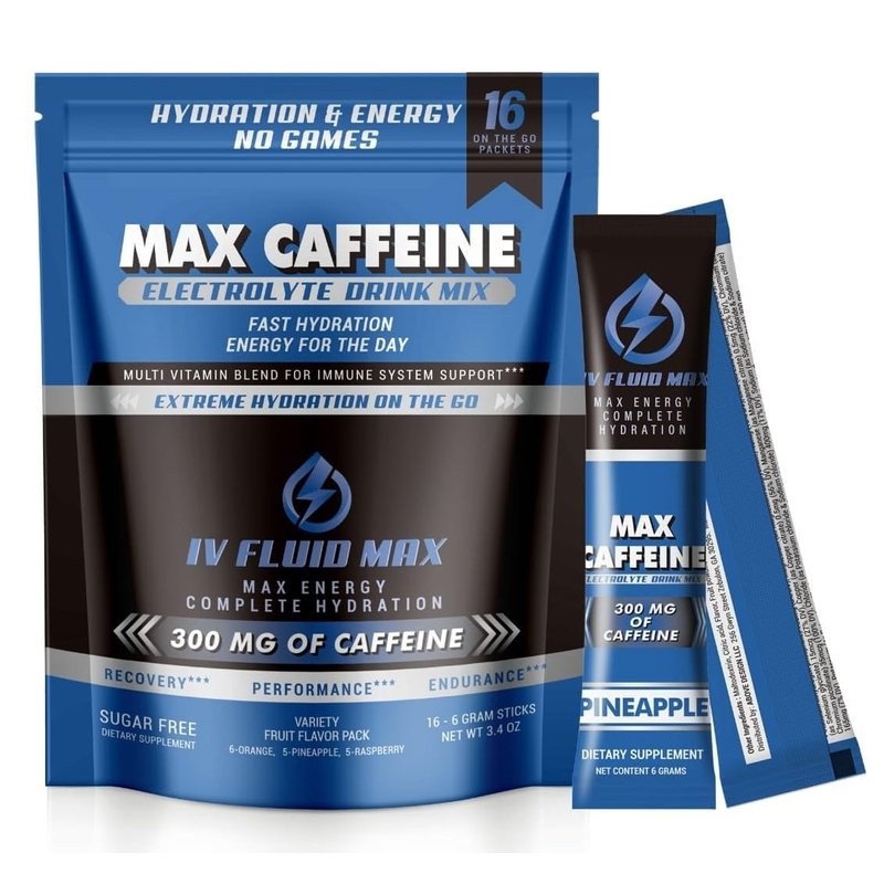 IV FLUID MAX - Hydration Acceleration - 300 mg Caffeine - Electrolyte + Energy Drink Mix - Preworkout/Recovery Drink
