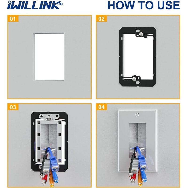 Iwillink 4-Pack Brush Wall Plate with Low Voltage Mounting Bracket, Cable Pass Through Insert for Wires, Single Gang Cable Access Strap, Wall Socket for HDTV, Home Theater Systems