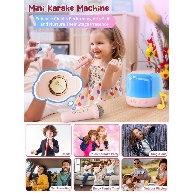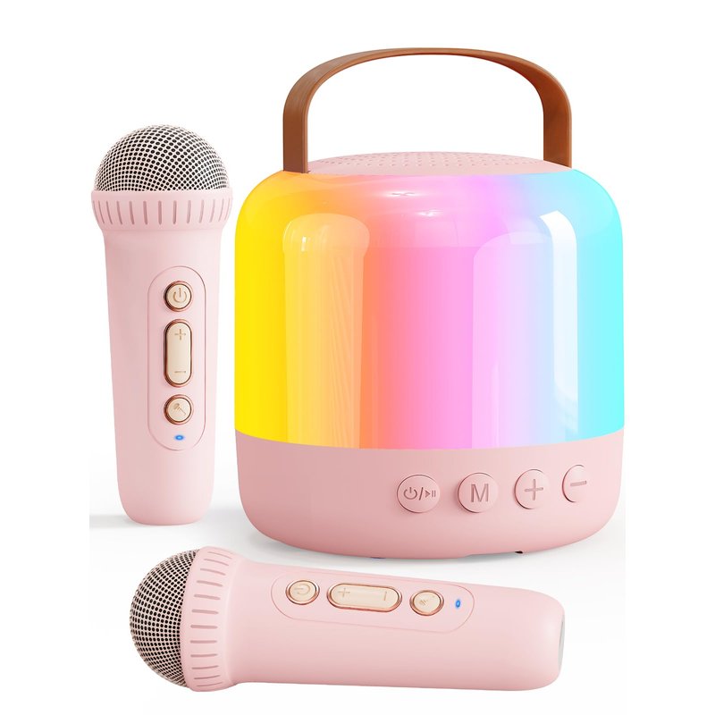Iyoyo Mini Karaoke Machine for Kids Portable Bluetooth 5.3 Speaker with 2 Wireless Kareokee Microphones, 360° Colorful LED Light Karaoke Toy Gifts for Girls Boys Ages 4-12 Birthday(Peach Pink-2 Mic)