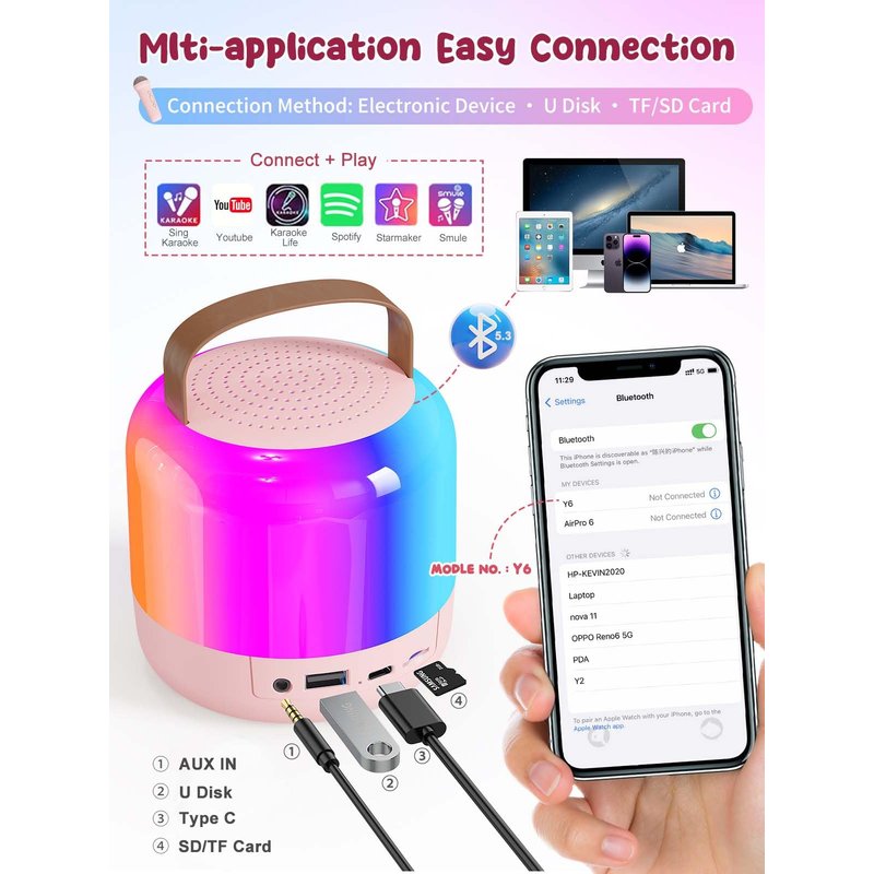 - ✅Bluetooth 5.3 + Low Latency Technology:Our karaoke machine for kids incorporates Bluetooth 5.3 technology, which ensures crystal-clear sound and low latency. This advanced feature eliminates waveform distortion, allowing children to enjoy pure and clear music and singing. It is the perfect choice for engaging family-oriented interactive KTV sessions, making it ideal for outings and road trips.