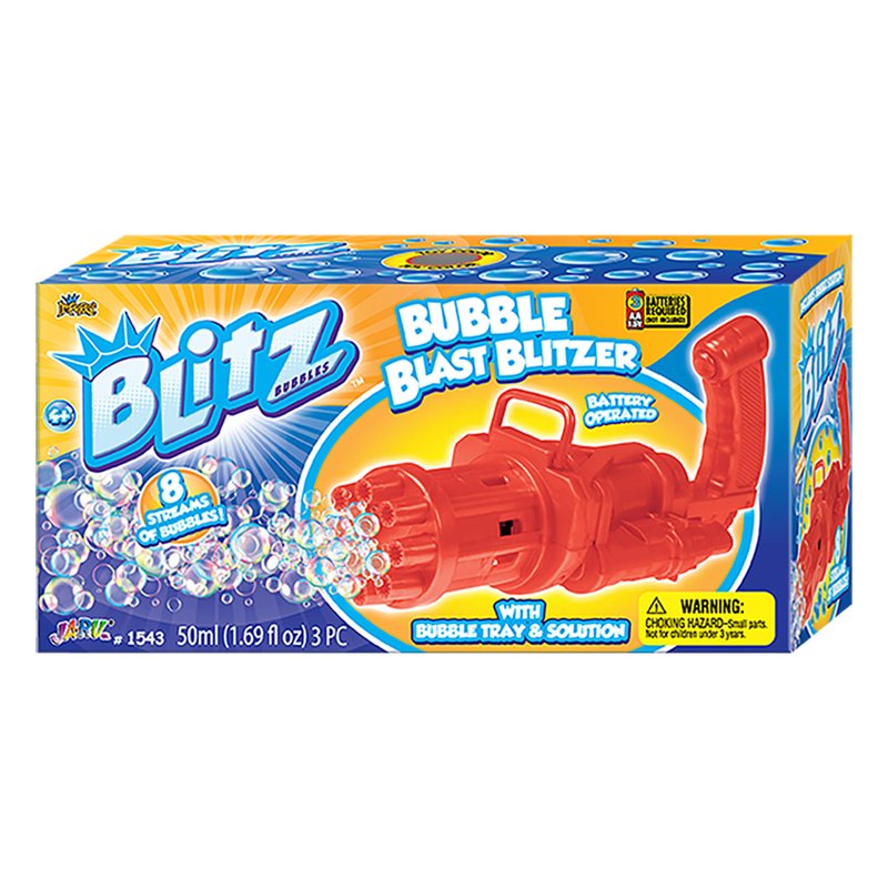 - 1 PACK OF BLITZ BUBBLE BLAST BLITZER - Each pack comes with 1 bubble gun blaster, 1 bubble tray, and 1 premium scented bubble soap solution. The bubble gun toy comes in random assorted color (red, blue, yellow). 8 holes bubble toy gun that can generate a lot of bubbles in an instant.