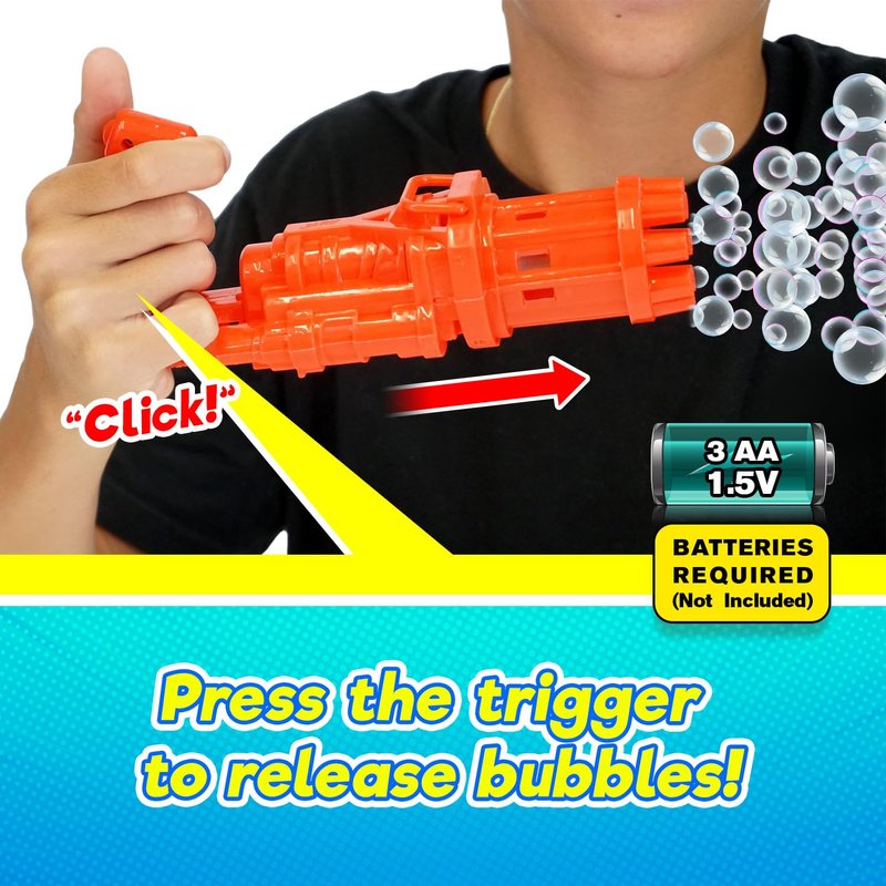 - SAFE & NON TOXIC SOLUTION - USA approved and ASTM tested toys. Each bubble solution is made from high quality, non-toxic and hypoallergenic liquid soap solution, which is safe for your kids to play with. The bubble toy gun is made with very durable & BPA-free materials. Designed to ensure long-lasting use. DISCLAIMER - BATTERIES NOT INCLUDED.