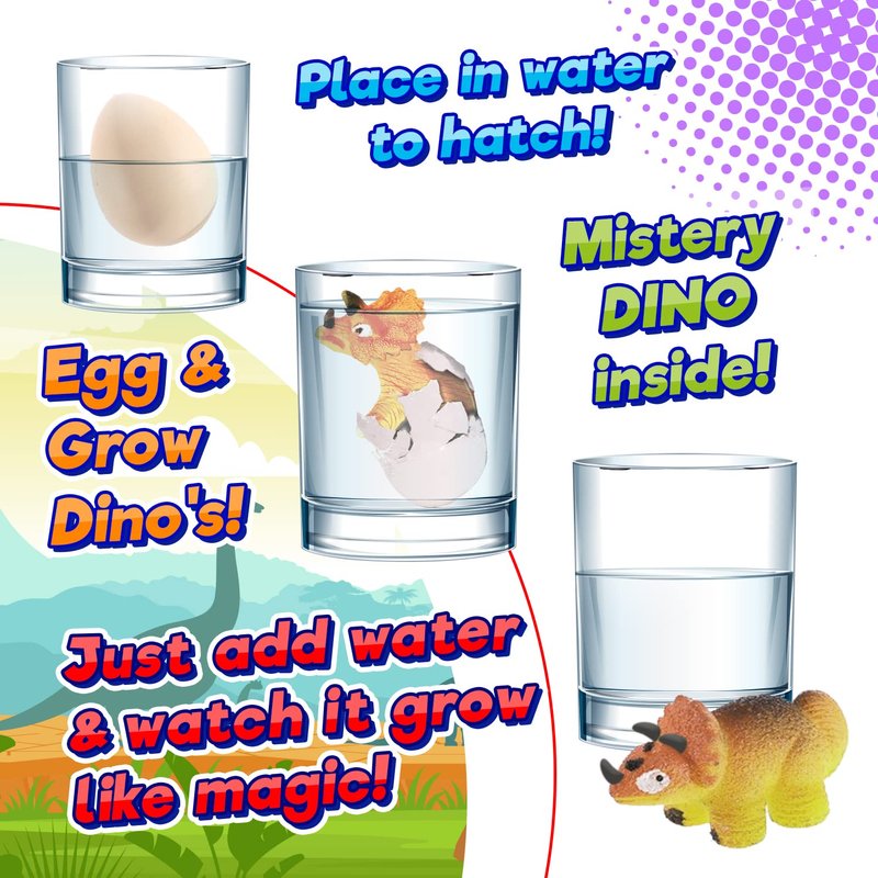 Welcome your kids into the jurassic dinosaur world filled with surprise and mystery. Magical hatching and growing bath toys for kids. Best choice: Made with non-toxic eco friendly super absorbent special polymer. Just place in a bowl or bathtub full of water and let it hatch and grow over time. Develop your kids' curiosity and knowledge about dinosaurs and other animals. Your kids will learn more as they wait patiently as they observe the changes within the toy as time passes by. Ideal for party favor pack, birthday goodie bags, Easter egg surprise, Christmas stocking stuffers.