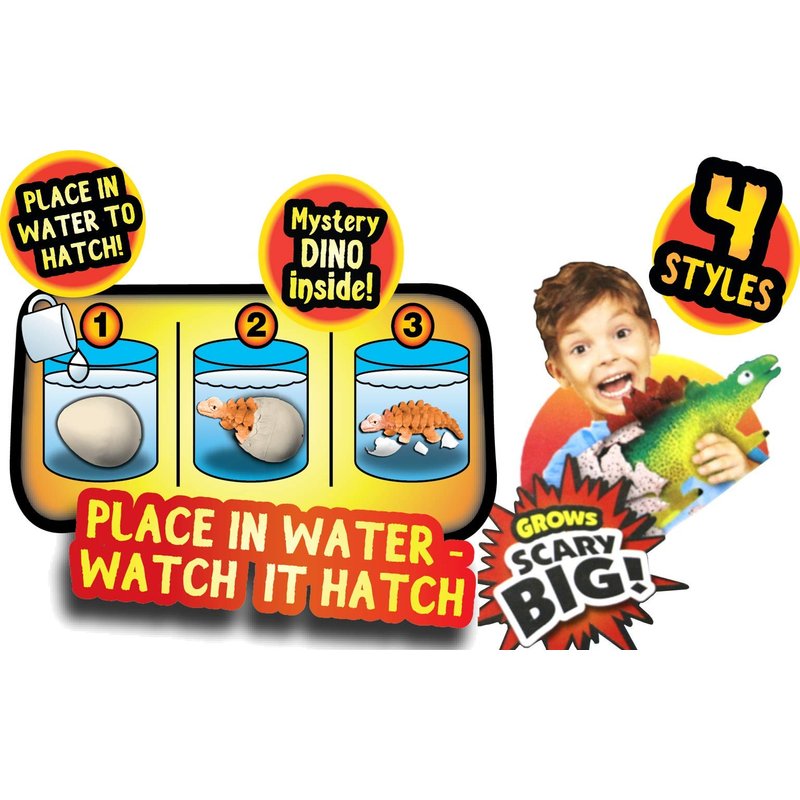 - 1 INDIVIDUAL PACK OF MAGIC MYSTERY DINO EGGS W/ DISPLAY BOX - 4 Different and randomly assorted Dinosaurs, Dragon & Animal Toys. Hatch in water to reveal the surprise dinosaur inside and let it stay in the water over time to grow to its maximum size. Hatching and growing magical animal toy for kids, boys and girls.