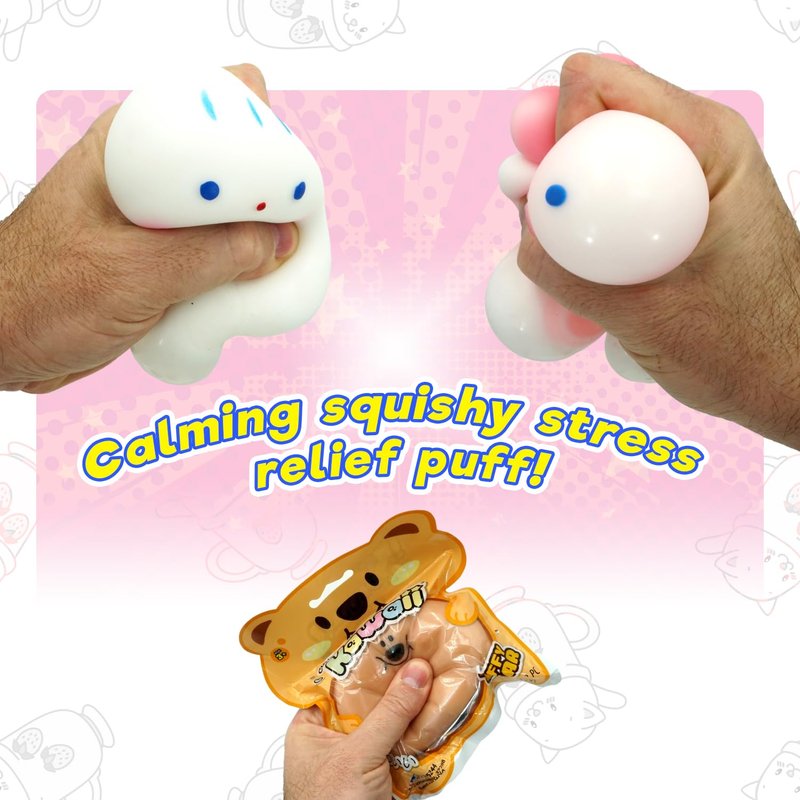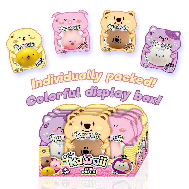 - 4 Pack of Cutie Kawaii Puffy Animal Squishies - These Mochi Squishy toys are ridiculously cute and fun to play and squeeze. Assorted Animal style (Cat, Dog, Pig, & Bear) Plus 1 FunaTon Sticker.