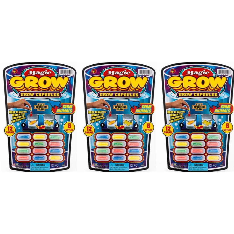 - 3 Packs 36 Capsules. 12 Magic Grow Capsules Each Pack. EXPANDABLE FOAM SEA CREATURES Fish, Animals and Dinosaurs Assorted PILLS: 12 capsules in Each Pack of various Colors & Shape. Plus 1 FunaTon Sticker.