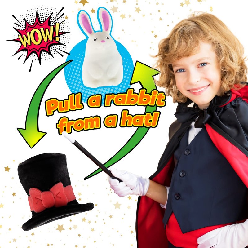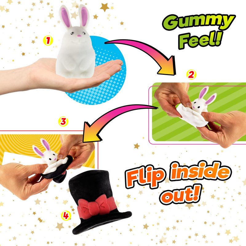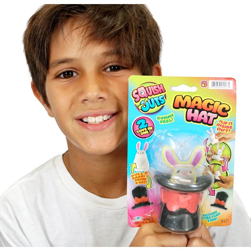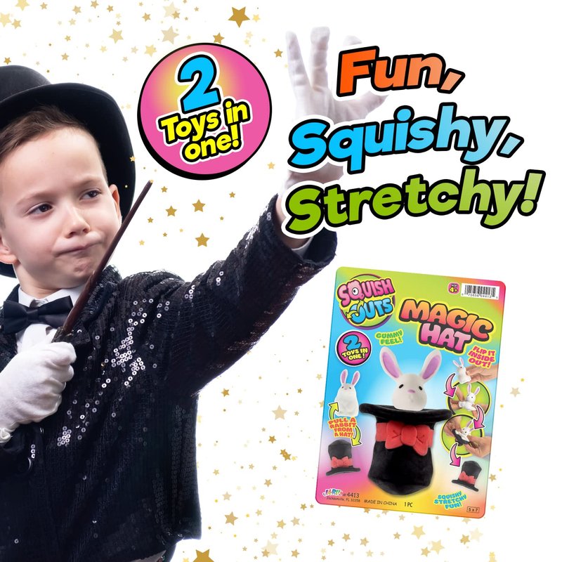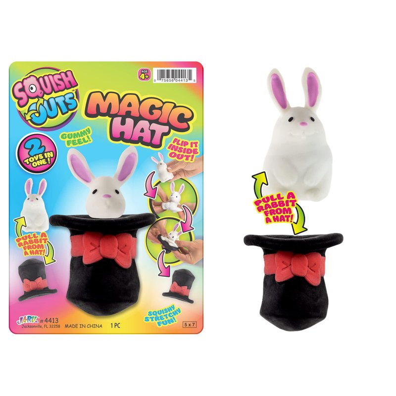 Ja-Ru's Squish Outs Magic Hat Mini Rabbit Squishies is ASTM tested and made of high quality and non toxic materials. 1 toys in 1. Pull the rabbit from the hat and flip it inside out to put it in again inside. Has a gummy feel for a more fun squeeze ease. Wonderful stress relief and decompression toy . Good for hand muscle and joint relaxation. Suitable for Kids and Adult. Easy to clean and durable for more squeezes.