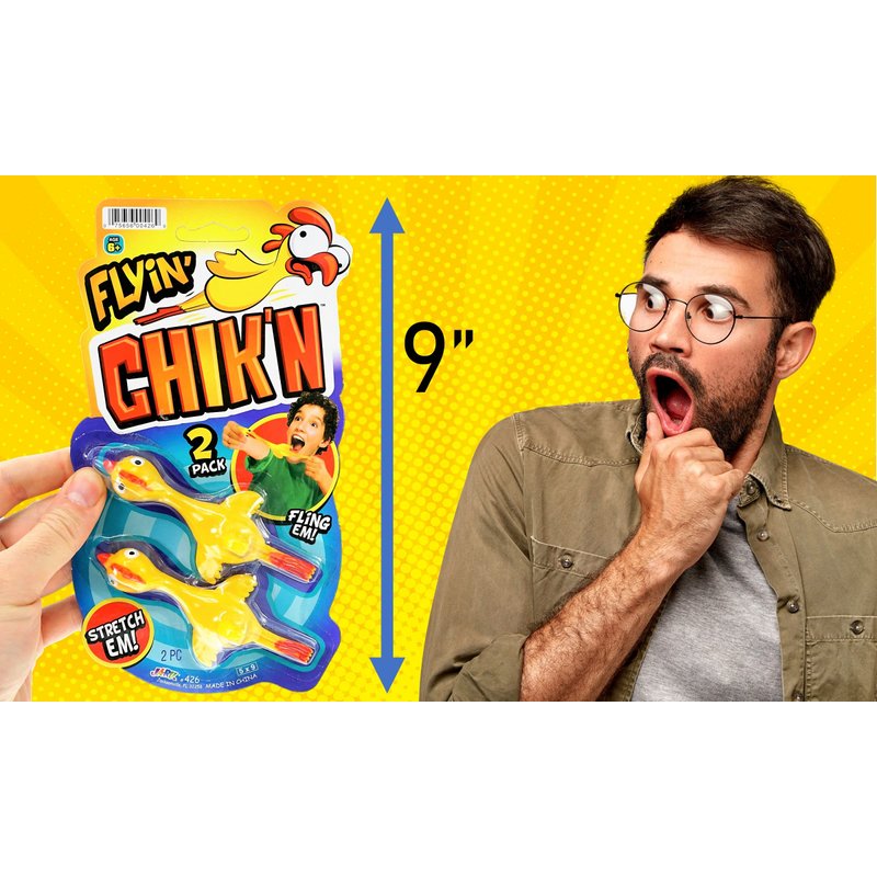 - 24 Pack of Flying Chicken Slingshot Toys (48 Units Total) - Each pack comes with 2 rubber chicken slingshot. These chicken toys for kids are designed for finger flicking action. Plus 1 Collectable JA-RU Bouncy Ball.