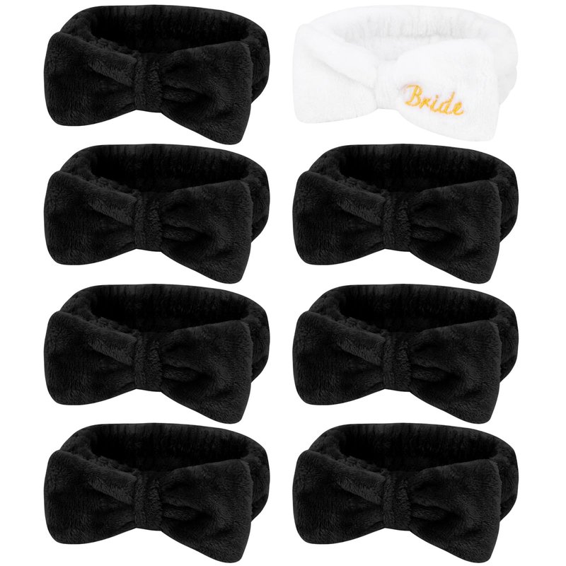 Complete Your Party Decor This deluxe set includes a white bride spa headband and 7 black spa bridesmaid headbands, providing a complete solution for your special day skincare routine. Perfect gift for bride and bridesmaid. They'll love receiving these cute accessories as part of their bridesmaid proposal or at the bachelorette party. The soft and stretchy coral velvet headbands are designed to keep your hair neatly pulled back and away from the face during face wash, masks, makeup application or other skincare treatments. Exquisitely made with advanced sewing technology, the headbands are perfectly tailored into comfortable circles. The all-in-one skincare set is a perfect gift for women who love makeup and spa. Pamper yourself or share the joy of skincare with friends and family. This deluxe spa gift set will be appreciated by all beauty lovers. Transform your skincare regimen into a daily indulgence with this must-have beauty tools set. Get salon quality results and experience in the comfort of your own home. Be flawless and fabulous! The stitching is flat, firm and smooth, ensuring durability and long term use. Made of high quality coral velvet, the headbands are very comfortable to wear and gentle on skin. They fold into a compact size for easy storage in your vanity case or travel bag.