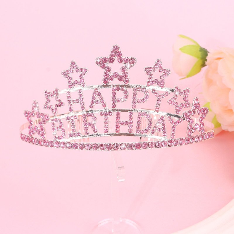 This birthday crown is a hair comb style tiara with the words "HAPPY BIRTHDAY" adorned in sparkling pink rhinestones. The tiara is made of high-quality silver metal and features a circle of five-pointed stars surrounding the "happy birthday" font, making it stand out even more. It is perfect for birthday celebrations and makes a great gift for yourself or a loved one. The tiara is also very easy to attach and won't fall out easily, ensuring that you can enjoy your birthday celebration without any worries. Overall, this tiara is a practical and beautiful essential for any birthday celebration, adding a touch of festivity and making the day even more memorable.