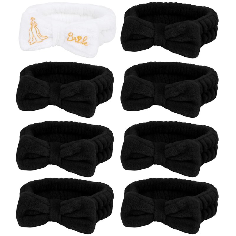 Complete Your Party Decor This deluxe set includes a white bride spa headband and 7 black spa bridesmaid headbands, providing a complete solution for your special day skincare routine. Perfect gift for bride and bridesmaid. They'll love receiving these cute accessories as part of their bridesmaid proposal or at the bachelorette party. The soft and stretchy coral velvet headbands are designed to keep your hair neatly pulled back and away from the face during face wash, masks, makeup application or other skincare treatments. Exquisitely made with advanced sewing technology, the headbands are perfectly tailored into comfortable circles. The all-in-one skincare set is a perfect gift for women who love makeup and spa. Pamper yourself or share the joy of skincare with friends and family. This deluxe spa gift set will be appreciated by all beauty lovers. Transform your skincare regimen into a daily indulgence with this must-have beauty tools set. Get salon quality results and experience in the comfort of your own home. Be flawless and fabulous! The stitching is flat, firm and smooth, ensuring durability and long term use. Made of high quality coral velvet, the headbands are very comfortable to wear and gentle on skin. They fold into a compact size for easy storage in your vanity case or travel bag.