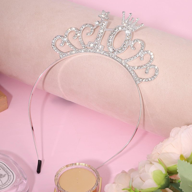 10th metal birthday headband is a trendy and stylish accessory that is perfect for your princess. Crafted from high-quality materials, this headband is built to last and provides a comfortable fit. The addition of rhinestones to the "10," pentagram, and crown detailing adds a touch of glamour and catches the light beautifully, making it a standout piece. The silver colorway complements any skin tone and adds a classic, sophisticated touch to any outfit. The silver finish of the metal and rhinestones coordinates with a variety of fashion choices, making it a versatile accessory for different events and occasions. The silver rhinestones catch the light beautifully, adding a touch of glamor and sparkle to any ensemble. The "10" numeric metal birthday headband is a personalized and unique choice for anyone who loves this number or is celebrating a special birthday or anniversary. Overall, this headband is a must-have accessory for anyone who wants to add a touch of style and personality to their look.