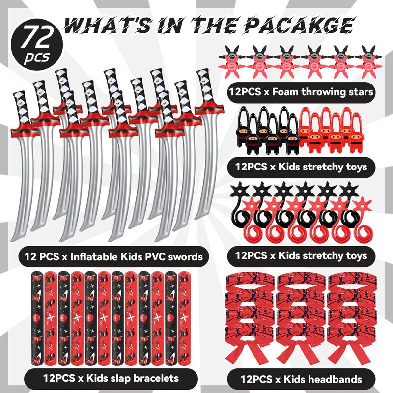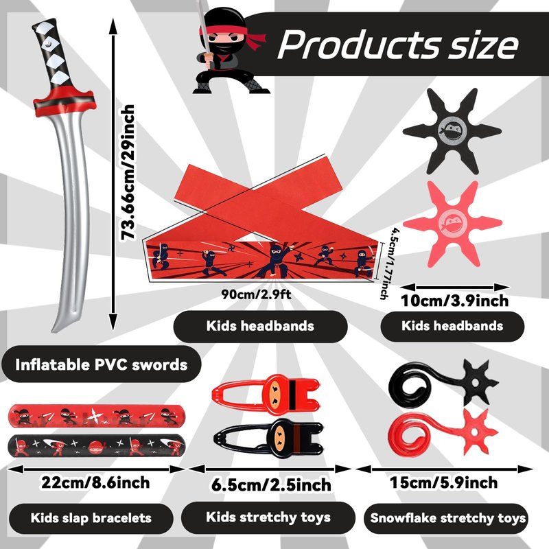 - What You Will Get: You will receive 72pcs karate party favors, including 12pcs inflatable karate PVC swords, measuring about 30 x 6 inches, proper size for you to hold, 12pcs karate headbands, measuring about 35.4 x 1.77 inches, suitable for most people, 12pcs slap bracelets, 12pcs foam throwing stars, 12pcs karate stretchy flying toys, 12pcs stretchy snowflake toys. The abundant kits and rich styles will satisfy your various needs and replacements.