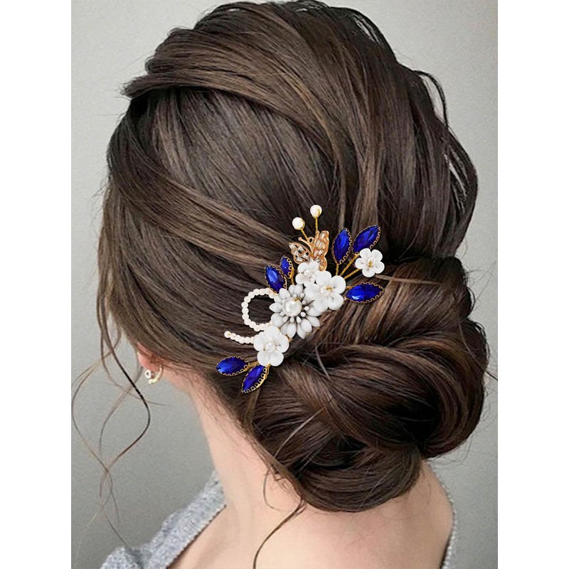 Jakawin Flower Bride Wedding Hair Comb Blue Crystal Bridal Hair Piece Bridal Hair Accessories for Women HC149 (Gold)