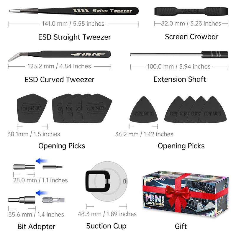- 【APPROPRIATE SCREWDRIVER SET】 This compact screwdriver repair tool kit features a stackable design and shaped like a container, allowing multiple sets to be stacked. 160 common magnetic bits are built into the 4 partitions for easy access and won't fall out. Each bit is marked with standard or inch markings for quick identification of the screwdriver bit you need. Also included are straight and curved ESD tweezers, opening picks, crowbar, suction cup for easy screen removal and carrying.