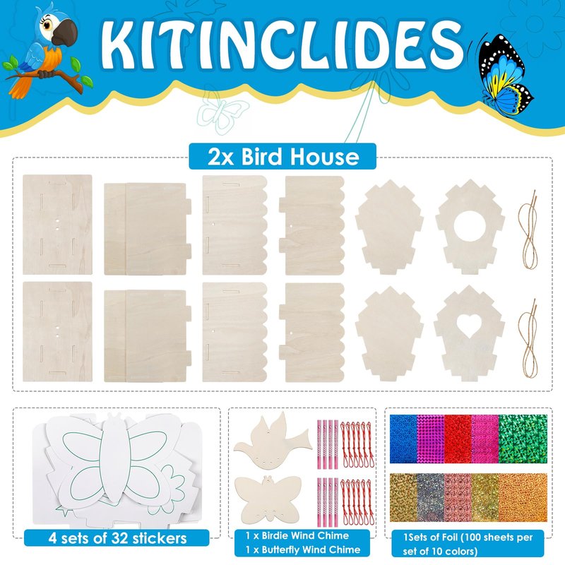 - 【FOIL CRAFTS FUN KIT】The Children's Gold Foil Fun Art Birdhouse Set includes 2 birdhouses, 4 sets of 32 stickers, 1 set of 100 sheets of 10 coloured craft gold foil and 2 wind chimes. The 4 sets of stickers can be used on both sides of the board and each set can be designed in 2 different styles and swapped to create different birdhouses to inspire creative thinking