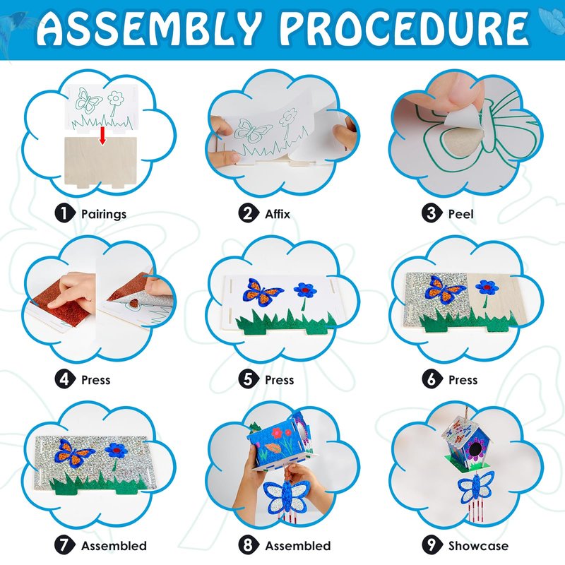 - 【EASY TO USE】Choose a birdhouse panel, apply the stickers, peel off the protective film, stick on the shiny tin foil and assemble a lifelike birdhouse! Peel off the small patterns first, then stick the tin foil on for colour, then peel off the larger patterns. The smaller patterns can be peeled off with aids, taking care to protect the stick able areas
