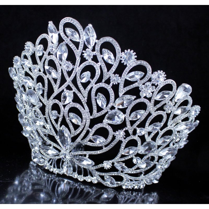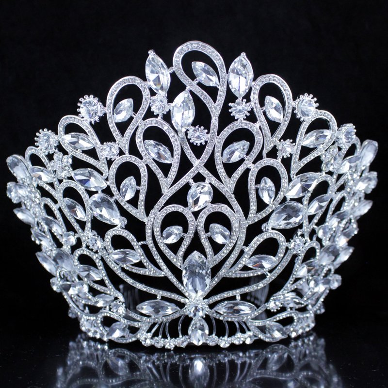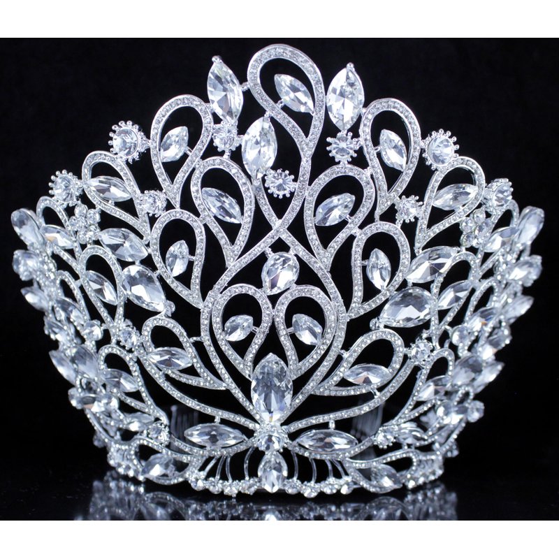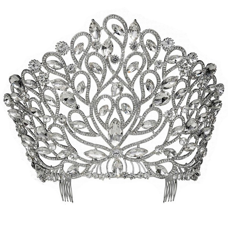 - This is fancy large beauty queen Austrian rhinestone tiara crown with hair combs in a beautiful floral design. Glittery Clear Austrian rhinestones are heavily set on Silver-plated metal. Rhinestones go all the way to the back of the tiara. All rhinestones shine a lot! Sides hair combs for extra security. This tiara is perfect for wedding, party, prom, pageant or any special occasions!