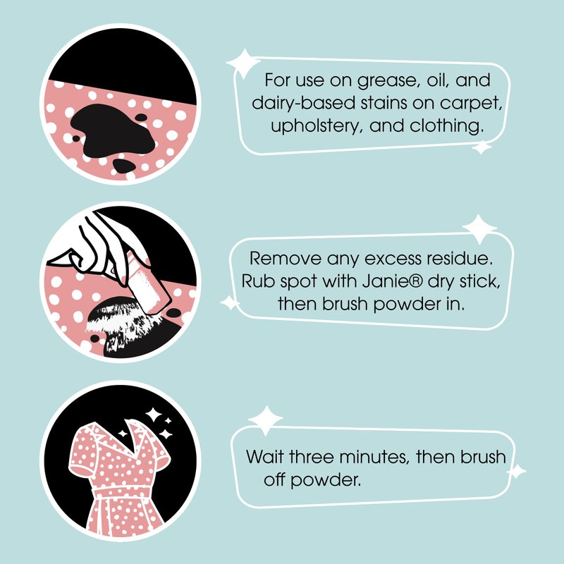 - ALL NATURAL: solvent-free, For oil- and grease-based stains on all fabrics, nothing works better than the Janie Stick