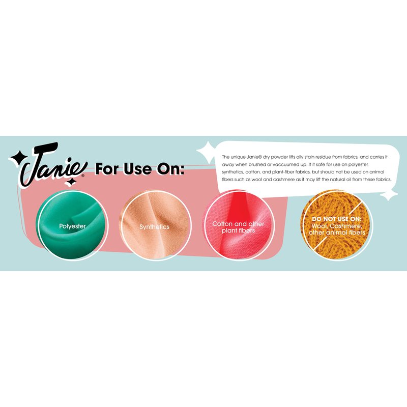 - SAFE: Any fabric, any color, Janie goes on dry, absorbs oil, grease, and dairy-based stains, and never leaves a ring