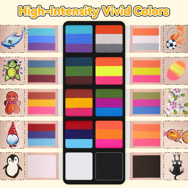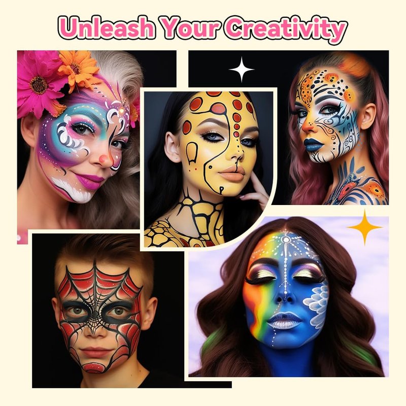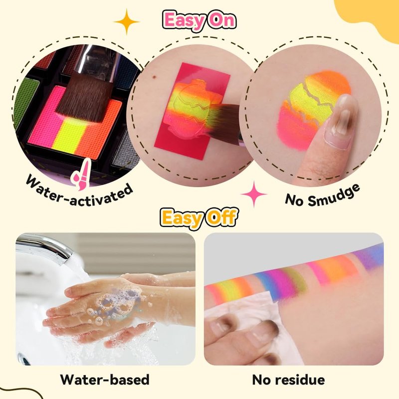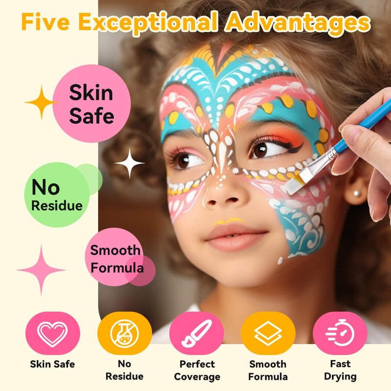 - 🎨【Easy Application & Clean】Mix with water before using the face bodypaint, spray some water on the desired color or wet your brush and use a brush to spread the facepaint evenly over the skin's surface. 【Warm Tips: For a vibrant shade, dip the brush back and forth 8-10 times.】The face paint for kids is completely water-based, so it is easy to clean and can be removed with warm soapy water, a damp cloth, or makeup remover.